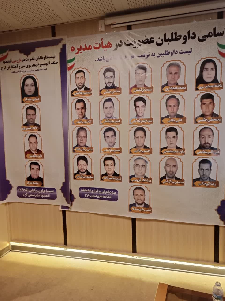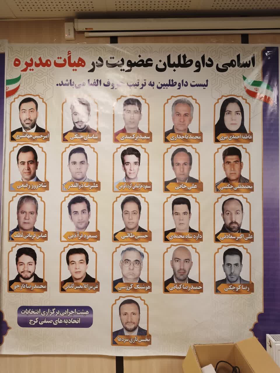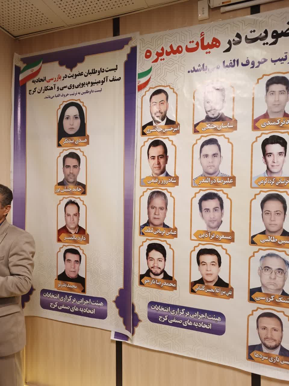 به استناد بند 10 ماده 15 آیین نامه اجرایی تبصره 3 ماده 22 و 23 قانون نظام صنفی (انتخابات هیأت مدیره و بازرس اتحادیه های صنفی ) انتخابات اتحادیه صنف آلومینیوم کاران شهرستان کرج در روز دوشنبه مورخ 1402.10.18 از ساعت ۹ صبح لغایت ۱۳ با حضور تعداد 230 نفر برگزار شد، و با توجه به حد نصاب 280 نفره ، انتخابات به حد نصاب نرسید و به دور بعد موکول شد.